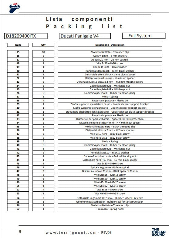 Het Termignoni 4USCITE Volledige uitlaatsysteem voor de Ducati Panigale V4 R (2019-2024) is speciaal ontwikkeld voor racegebruik om de beste prestaties over het gehele koppel- en vermogensbereik te behalen. Dit uitlaatsysteem, dat wordt gebruikt in de BSB en SBK, is de ideale keuze voor rijders die het maximale potentieel van hun Ducati op het circuit of op de openbare weg willen benutten.